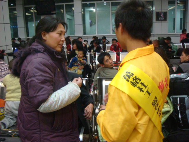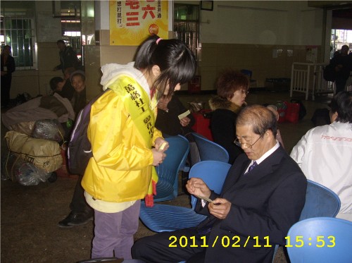 万格社工服务社爱在中华义工队志愿者在东莞火车站倡导公共文明。(2011-02-11)