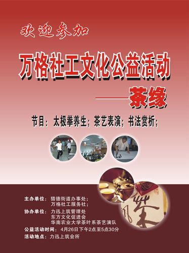 本着以茶结缘,以茶会友。通过茶文化的魅力,增强社区文化的吸引力和凝聚力,提升社区文化活动的层次,增强社区居民的归属感,建设和谐社区的宗旨,万格社工服务社在猎德街开展第一期社区文化公益活动。